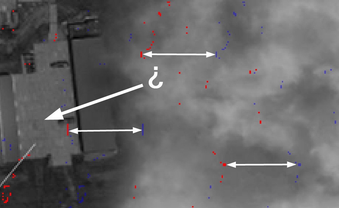 Shazbot, can you please estimate the probability of the coincidence found in another proof of photoshoping by Russia? This time it’s satellite imagery. Someone spotted photoshoping of this kind: “a whole bunch of pixels was copied exact same distance to the right”. The red and blue pixels have the same colour and are offset by exact same distance on the picture. This prooves that the image was photoshoped, right? It’s impossible that 100 or so pixels duplicated and shifted all by themselves.